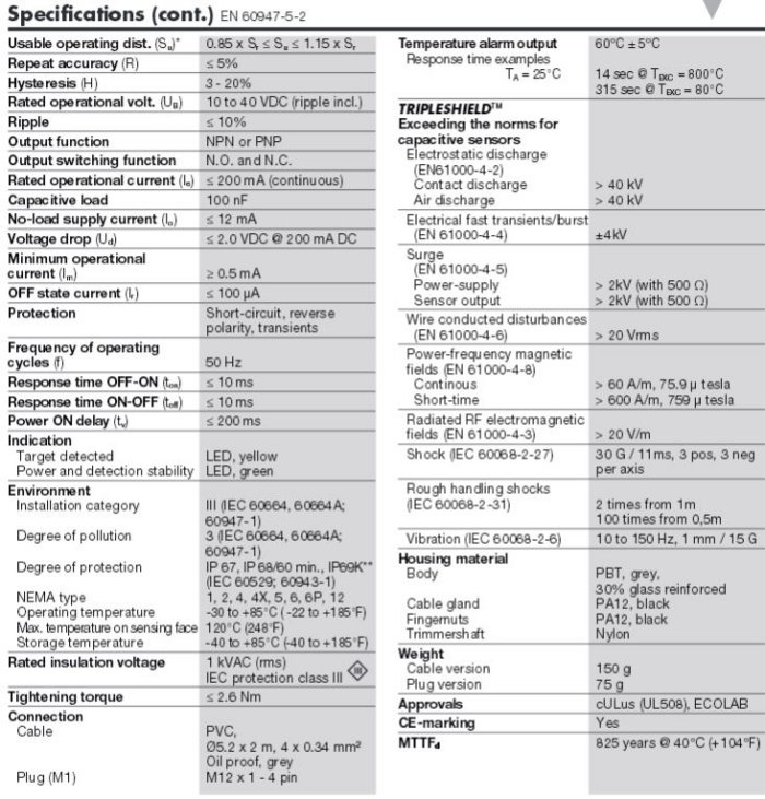 The CM 8CA.. capaciti ve proximity switches feature an improved 4th Generation TRIPLESHIELD™ technology. Furthermore, these sensors feature increased immunity to electromagnetic inteference (EMI), especially to frequency drives. Not only does 4th Generation. TRIPLESHIELD™ feature an increased EMI, but it also increases the immunity to humidity and dust. The implementation of stability indication eases the setup procedure as both Stable ON and Stable OFF positions are indicated by the Green and yellow LEDs. The sensing distance is increased by 25 % allowing room for additional stable detection. The Dust Alarm function gives an early warning that the sensing surroundings have to be cleaned. The Temperature alarm function raises an alarm if the sensing surface goes beyond 60 degree celcius. The sensor housing is featuring IP69K as well as approval by ECO LAB for cleaning-and disinfection agents.