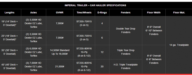 At Imperial Trailer Mfg., Inc. we offer a wide range of the highest quality car hauling trailers, suitable for vehicles of all sizes. Our very popular Car Hauler has become an industry standard. It’s low profile, easy to use self-storing ramps, high quality structure, treadbrite rock guards, full tread plate floor and all LED lighting are just a few of the features that make these trailers stand out. Collectors of hot rods and classic cars, alike, enjoy how well their Car Hauler complements their cars at shows. Our trailer allows for just about any low profile car to be loaded with ease because of the combined 11′ dovetail and ramp approach, 23″ – 25″ deck height and enough clearance to open their car door over the 8″ tall fender. These trailers pull so well you’ll forget you’re pulling them.