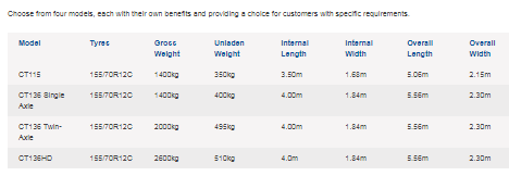 Both vehicle recovery and motor sport are catered for within the CT115 and CT136 trailer range. Twin high tensile galvanized steel structures are mounted on the exclusive Ifor Williams beam axle suspension and combine to give a versatile, strong and easy to use vehicle carrier. Utilising the same lightweight construction on all four models, the single axle CT115 and CT136 (1400kg gross), twin axle (2000kg gross) and heavy duty (2600kg gross) models are lightweight trailers giving a maximum payload capacity of 1000kg, 1500kg and 2100kg respectively.