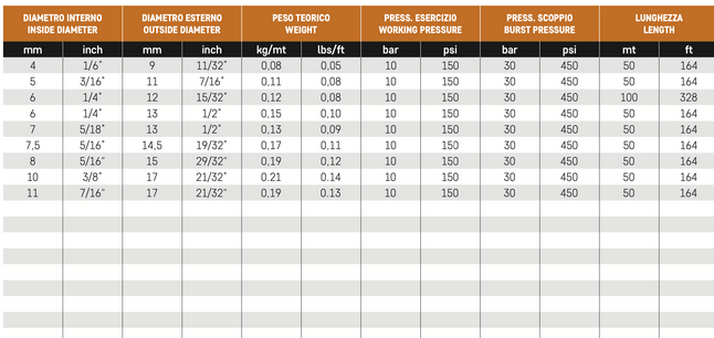 - Tube: black smooth NBR rubber, resistant to petroleum products with aromatic content until 50%