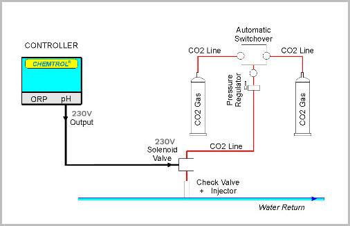 The schematic shows the principle of installation with an Automatic Switchover System which is recommended to assure continuous pH control. Control of gas injection is done by connecting the 230V pH control output of the CHEMTROL® controller to the solenoid valve on the CO2 injection line.