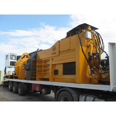 Hydraulic oil press installed on mobile platform with crane for self-feeding. Designed for packaging plastic. Fully autonomous. Thanks to its power allows the machine while performing the pressing process automatically, the operator can perform desired movements with the crane (load, preparing materials, etc ...).