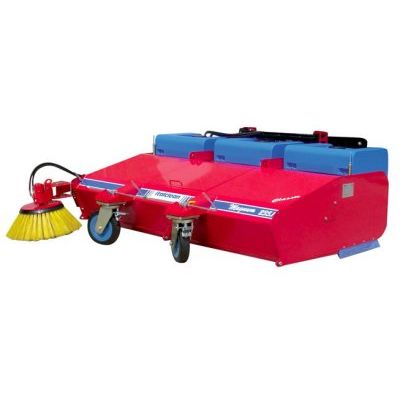 Carried and towed sweepers with dust container and water spray system. Water spray system, hydraulic driven. Recommended for cleaning of large surfaces. Wheels (4) made of full rubber diam.mm. 300 x 80 mounted on heavy duty castors : capacity kg. 2500 each.. The floating bottom of the dust container enables debris of 5-6 cm3 size to pass and to be picked up. The upper cover can be opened to introduce big wastes while the machine is stopped. Service brake.