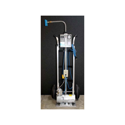 The regulator holds a constant pressure drop across an in-line orifice by varying the flow through a bypass valve into the pump. This system allows the pump to work at a minimum head drop at all times by permitting it to run cooler; thus extending its lifetime. The oil-less pump requires no lubrication to maintain optimal efficiency during its service life. The pump is mounted on a mobile cart with two rubber wheels to permit mobile transportation of the unit.
