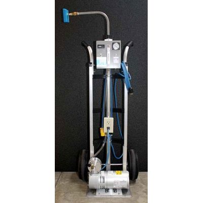 The regulator holds a constant pressure drop across an in-line orifice by varying the flow through a bypass valve into the pump. This system allows the pump to work at a minimum head drop at all times by permitting it to run cooler; thus extending its lifetime. The oil-less pump requires no lubrication to maintain optimal efficiency during its service life. The pump is mounted on a mobile cart with two rubber wheels to permit mobile transportation of the unit.