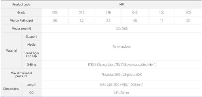 MP Series cartridge filters are absolute grade pleated filters made of 100% polypropylene. The polypropylene media in MP Series filters combines successive layers of microfibers to exhibit high porosity and a progressively smaller pore structure that increase the filtration performance of foreign matter. The filter components used are made of FDA-listed polypropylene, and according to the state-of-the-art method, all assemblies use a heat-sealing method. These processes provide excellent cartridge filters with excellent chemical compatibility and no other eluents for a variety of liquids and applications. MP series filters show over 99.9% filtration performance for each pore size.