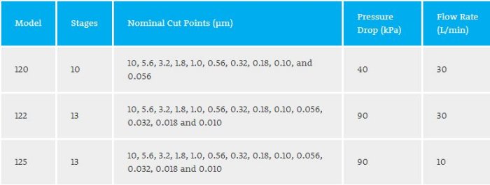 - Up to 13 impactor stages with nominal cut points between 10 nm and 10 µm, plus a final filter