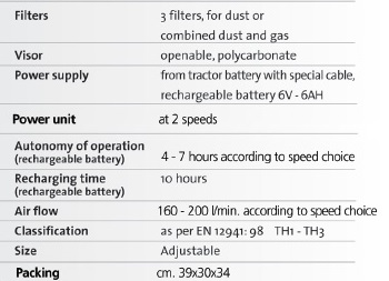 Agrofliter Is an Innovative breather for the protection against dust and gas. It Is equipped with a turbine which breaths In the air through the filters and directs It towards the peak, avoiding the steam. Also the contfnuos flow of air generates a positive presslon which avoids any breathing effort, ensuring comfort and preventing the contaminated air Intake.