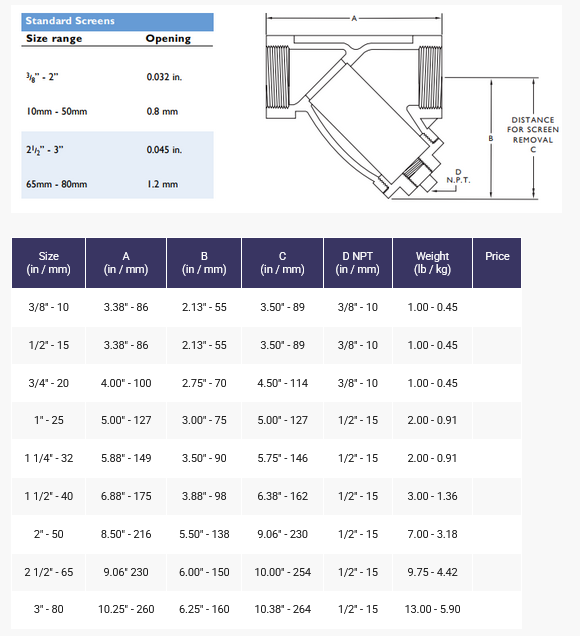 Design Features: Strainers are available with threaded (N.P.T.) or sweat (Class 125 Lb.Only) inlet/outlet connections. Strainer body meets ASME B16.15. Strainers equipped with threaded cover cap that utilize a flat gasket seal. Upper and lower machined seats. 304 SS mesh screens are standard. Perforated plate screens are optional. Drain/Blow-off connection furnished with plug as standard. Generous screen area and properly proportioned straining chamber to minimize initial pressure drop while maximizing time between cleanings.