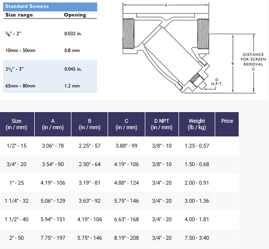 Design Features: Strainers are available with threaded (N.P.T.) or sweat (Class 125 Lb.Only) inlet/outlet connections. Strainer body meets ASME B16.15. Strainers equipped with threaded cover cap that utilize a flat gasket seal. Upper and lower machined seats. 304 SS mesh screens are standard. Perforated plate screens are optional. Drain/Blow-off connection furnished with plug as standard. Generous screen area and properly proportioned straining chamber to minimize initial pressure drop while maximizing time between cleanings.