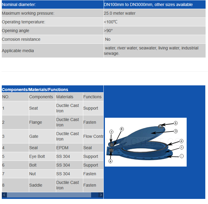 Cast iron flap valve applicable to water supply and wastewater treatment projects in various pipe and water channel as overflow, check effect, also can be applied to various vertical shaft manhole cover; Only for one-way water flow of round, square or rectangular export, the structure is simple, reliable work, no human operation, usable flange connection, also can connect with embedded parts fixed.