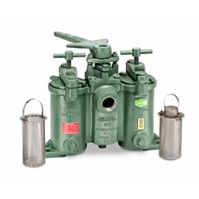 Model 72 and 72H series duplex strainers are furnished in both standard or high pressure models with NPT port connections. Flanged models are also available, described in other bulletins. Internal channels are 100% full-flow, having the same cross-sectional area as the equivalent pipe size. Standard pressure models are furnished with our quick-opening, hand-clamp closure for easy access. High pressure models are furnished with stud-and-nut body cover closure. Refer to our drawings A2333A and A2334A for sizes, ratings and dimensions. Materials of construction Include rugged cast iron bodies, covers, and valve plugs, and brass, carbon steel, stainless steel or monel baskets. Special valve plugs can also be furnished in stainless steel or other materials.