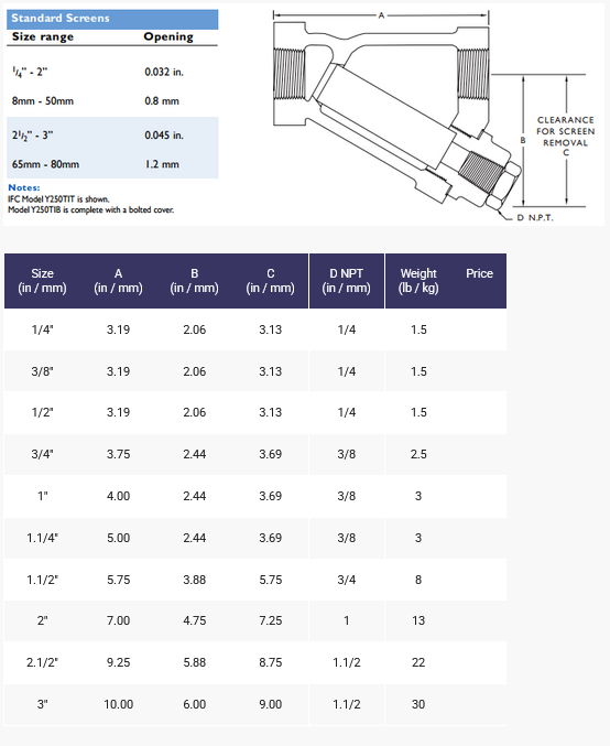 Strainers are equipped with threaded (N.P.T.) inlet/outlet connections. Strainer body meets ASME B16.4. IFC series Y250TIT strainers equipped with threaded cover cap that utilize a flat gasket seal. IFC series Y250TIB strainers equipped with bolted cover flange that utilize a flat gasket seal. Upper and lower machined seats. 304 SS mesh screens are standard. Perforated plate screens are optional. Drain/Blow-off connection furnished with plug as standard. Generous screen area and properly proportioned straining chamber to minimize initial pressure drop while maximizing time between cleanings.