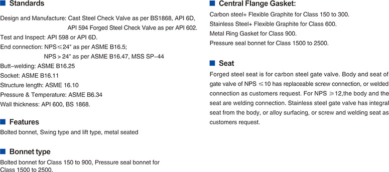 Design and Manufacture: Cast Steel Check Valve as per BS1868, API 6D, API 594 Forged Steel Check Valve as per API 602. Test and Inspect: API 598 or API 6D. End connection: NPS=s24" as per ASME B16.5. NPS > 24" as per ASME B16.47, MSS SP-44. Butt-welding: ASME B16.25. Socket: ASMEB16.11. Structure length: ASME 16.10. Pressure & Temperature: ASME B6.34. Wall thickness: API 600. BS 1868.