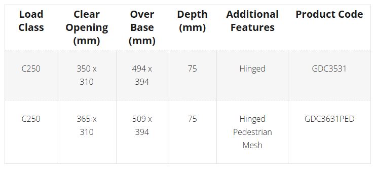 C250 Gully Grates – Suitable for kerbside channels of roads extending 50cm in to the carriage way or 20cm in to the footway. Ideal for car parks, petrol stations and where slow moving traffic is present. Our range of C250 gully grates are suited for kerb side applications on roads and in areas where slow moving heavy vehicles are present. The anti-theft hinge design prevents scrap metal theft and an additional stainless steel bolt can be added to deter unauthorised opening. For gratings in cycle paths or car parks we have a pedestrian mesh grating to give added safety.