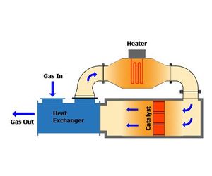 We still heat the gas directly by using a natural gas burner (or other gaseous fuel) but then instead of just raising the temperature up to the higher value, we need to raise the temperature enough so that as the gas passes over the catalyst it reacts and is converted to Carbon Dioxide and water vapor.