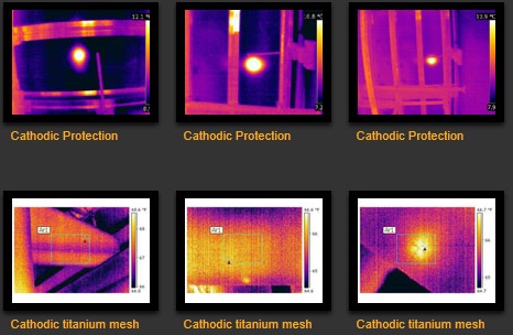 A short circuit from a break in the Cathodic mesh forms a thermal anomaly visible on the outer concrete layer itself removing the need to strip it all away. Savings on this application can be extremely significant.