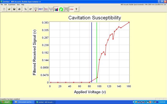 The ABS-CSM system uses a similar hardware set as our bubble size measurement instrument, the ABS Acoustic Bubble Spectrometer system, and interrogates the cavitation susceptibility of a liquid sample by systematically increasing the excitation voltage applied to an acoustic pressure generator in order to create an oscillating pressure field to excite any bubble nuclei in the liquid. As the intensity of the oscillating pressure field exceeds a threshold, cavitation events (explosive bubble growth and collapse) start to occur and high frequency collapsing bubble pressures are emitted. These are then detected by a high sensitivity pressure probe. Dynaflow proprietary software controls the instrument operation, the acoustic emission and detection, and the signal analysis. The initiation of cavitation is detected as a sudden significant increase in the received signal of interest.