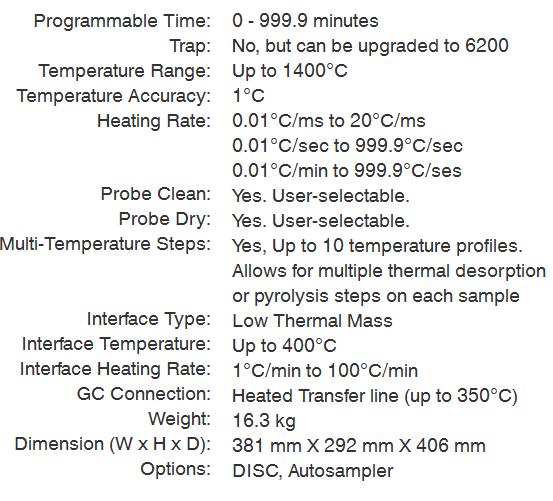 The 6150 Pyroprobe is guaranteed to pyrolyze with the highest reproducibility within 2%, and allows the widest range of programming temperatures when compared to other pyrolyzer techniques.