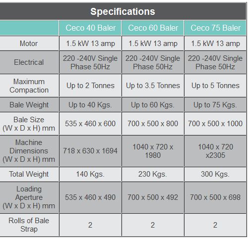 The Ceco 40, 60 & 75 Balers are small compact machines which are ideal for locations where space and height are limited. The 75 is the best selling machine in our complete range. The machines will bale compact bales of cardboard, plastic or paper that are easy to handle. A bale lifting trolley is available as an optional extra. Suitable for shops, restaurants, hotels, bars, schools, offices, etc. the machines are fully CE compliant and supplied complete with warranty. Built strong they are ideal entry level machines for the small to medium producer.
