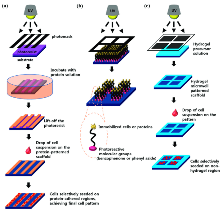 Our soft lithography procedures are capable of producing microstamps for microcontact printing, microtemplates, and polymer channels for microfluidic patterning. We utilize a fully biocompatible process to achieve high-throughput, high-efficiency cell patterning and achieve high-efficiency patterning of adherent and non-adherent cells. Our lithographic approach allows protein patterning and indirect cellular patterning after master molds are fabricated using dead-end microfluidic channels as small as 10 µm in size and with nearly all equipment available in biological laboratories. Furthermore, the patterns we generate on the wafer during the lithography process can generate specific microchannel networks for the flow and deposition of protein solutions in the desired pattern. In our patterning strategy, cells can be deposited with the solution rather than added after the protein pattern is generated.