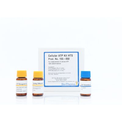 Cellular ATP Kit HTS is intended for enumeration of viable cells by quantification of cellular ATP (adenosine triphosphate). The assay is intended for rapid analysis of cytotoxicity and proliferation in cell studies. The assay of cellular ATP replaces methods such as tritiated thymidine incorporation and tetrazolium salt reduction. If a stable light emission is not obtained, the ATPases are not completely inhibited. We then recommend the Cell Viability Kit SL containing a strongly ATPase inactivating agent.