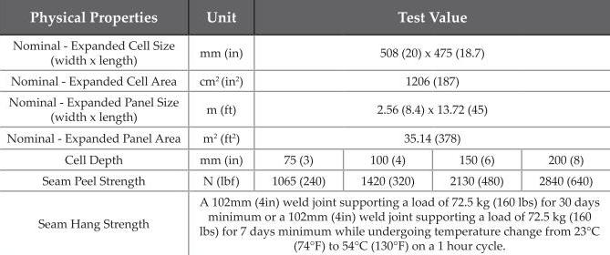 Envirogrid EGA 40 standard sections are manufactured from 58 strips of HDPE, resulting in a section length of 29 cells and 5 cells wide. Each strip is the appropriate width and 142 inches (3.6m) in length. Weld spacing is 28.0 in ± .12 in (711 ± 3mm). Cell density is 9 cells per meter squared. Cell walls are textured and if perforations are required 16% ± 3% of the cell wall is removed.