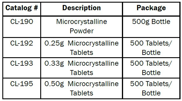 High density is ideal to be used as a backing. Suitable for milling hard and abrasive homogeneous samples. Able to withstand extreme high pressure during the milling cycle. May be used as a binder. Available in powder, 0.25, 0.33 and 0.50 gram tablets. Available in high density granular (CL-190).