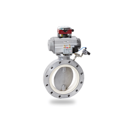 Butterfly Valve with pneumatically charged sealing here with pneumatic actuator. Range of Nominal Widths: DN 50 - DN 1200. Operating Temperature: - 40°C to + 200°C*. Differential Pressure: up to 6 bar*. Sleeve: replaceable or fix vulcanized