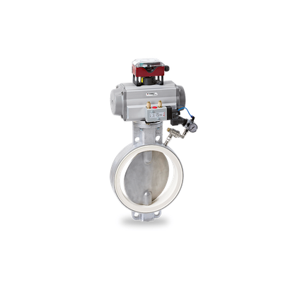 Butterfly Valve with pneumatically charged sealing here with pneumatic actuator. Range of Nominal Widths: DN 50 - DN 450. Operating Temperature: - 40°C to + 200°C*. Differential Pressure: up to 6 bar*. Sleeve: replaceable