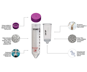 The SuperClear® tube with FILTROX® PURASPIN® is an ultra high performance centrifuge tube and cap combination that includes a removable FILTROX® funnel insert. The funnel insert includes a FILTROX® filter medium available in various formats and a nossle that can be fitted to a luer locking syringe or hose. The cap keeps the FILTROX® spinner securely in place with its unique elastomeric seal. The entire assembly forms a neat package that can be disposed of after use. Both the tube, cap, and spinner are made of USP Class VI resin.