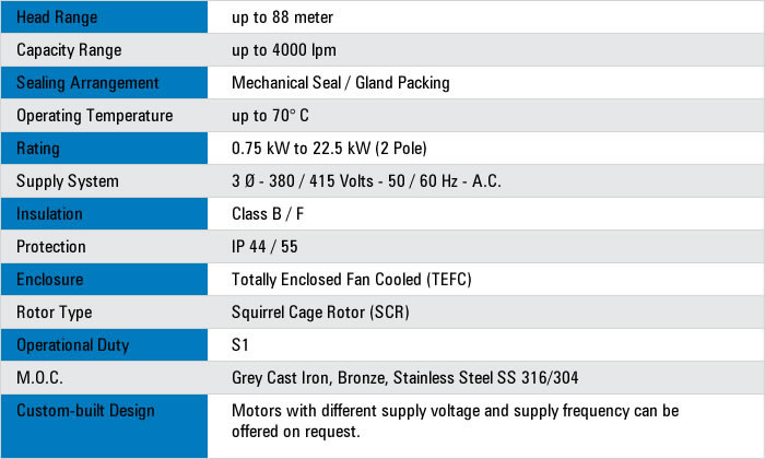 Design Features: Horizontal, Centrifugal, Monoblock (pump & motor have been combined to form a single unit) type pump fitted with single stage closed Impeller in Volute Casing having axial end suction and vertical centerline delivery. No fear of motor burning due to wide operating voltage range and Non-overloading power characteristics at any operating point. Advantage of mounting space saving due to elimination of base plate, coupling and coupling guard.