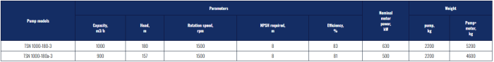 Centrifugal pumps of TSN 1000-180-3 are designed for pumping of water and liquids having properties in viscosity and reactivity similar to water, with temperatures up to 373 K (100° C), the content of solid particles by weight of 0.05% and a maximum size of 0.2 mm. Pumps are manufactured in a climatic category of a moderately cold climate – they are designed for macroclimatic regions with temperate and cold climates, placement category 4 – operation in rooms (volumes) with artificially controlled climate conditions.