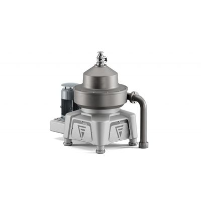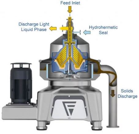 The separated material particles are periodically removed via a hydraulic system in the lower part of the bowl at maximum speed. The clarified liquid flows from the disc stack to a centripetal pump and is discharged under pressure.