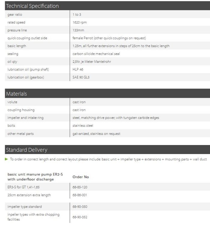 The EURO-P ER2 is a robust vertical centrifugal slurry pump, available with either an electric motor (ER2-E) or tractor PTO drive (ER2-S). Designed for stationary installation in slurry pits and tanks, it enables seamless switching between pumping and mixing via a slide gate. The 270° rotary and 60° vertical adjustable mixing nozzle efficiently homogenizes slurry by flushing sediment or disrupting floating layers before pumping. Thanks to its underfloor discharge, the pump can be uncoupled from above without entering the pit, vastly improving safety and convenience. The cast-iron housing, hardened steel impeller with intake screw, and carbide edges ensure superior durability and performance under abrasive and fibrous conditions. Available extensions in 25 cm increments accommodate pit depths starting from 1.25 m.Most popular related searches