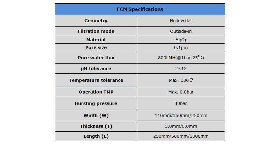 FCM flat sheet membrane is made of Al2O3, which is suitable for solid-liquid separation and MBR in harsh situations. TFT’s FCM flat sheet membranes are made of Al2O3, which are characterized by their excellent chemical and thermal stability and their resistance to harsh chemical cleaners. The separation layer of FCM is coated on the surface, which makes FCM only used in outside-in mode. In order to maintain the filtration ability and flux stability, aeration is usually used to reduce the fouling on the surface.