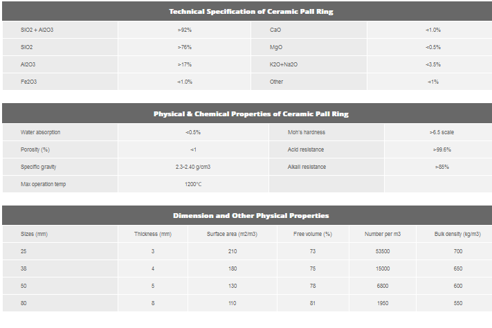 Ceramic Pall Ring with excellent acid resistance and heat resistance. They can resist to corrosion of various inorganic acids, organic acids and organic solvents except hydrofluoric acid, and can be used in high or low temperature conditions. Consequently their application ranges are very wide. Ceramic Pall Ring can be used in the drying columns, absorbing columns, cooling towers, scrubbing towers in chemical industry, metallurgy industry, coal gas industry, oxygen producing industry, etc.