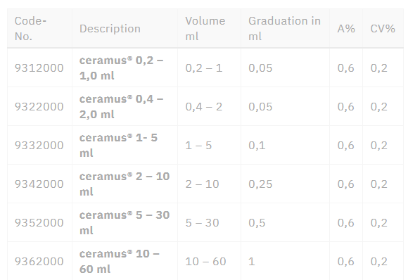 The dispensing piston made of high-purity aluminium oxide ceramic and the DURAN® glass cylinder guarantee a maximum level of chemical and thermal resistance. The high-quality materials in all parts conveying medium enable the use of ceramus® within a temperature range from 4° C to 50° C. The complete unit can be steam sterilised at 121° C without dismantling. A special ceramus® HF version designed for dispensing very aggressive media is also available. The piston and cylinder are made of high-purity aluminium oxide ceramic, the valve seats and balls are ceramic and valve springs are made of platinum / iridium.