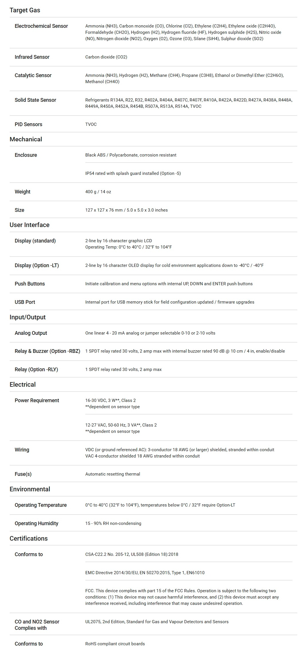 For monitoring: Ammonia, Carbon monoxide, Carbon dioxide, Chlorine, Ethylene, Ethylene oxide, Formaldehyde, Hydrogen, Hydrogen fluoride, Hydrogen sulphide, Nitric oxide, Nitrogen dioxide, Oxygen, Ozone, Sulfur dioxide, Ethanol, Dimethyl ether, Methanol, Methane, Propane, Hydrogen, TVOCs, Refrigerants