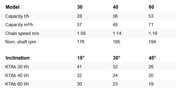 Manufactured from galvanized material and in accordance with the EU machinery directives. It is suitable for 15°, 30° and 45° degree conveying. It runs very quiet and is totally enclosed and dust free in operation. Brush gear for intermediate outlets can not be used on KTAb. It is as standard a Category II 2D/0D Conveyor and complies with the European ATEX directive 94/9EC. When operating in a farm drying and storage plant handling different types of grain, the internal atmosphere complies with Zone 21 and the external is unclassified. If the conveyor operates in a plant where the external atmosphere is classified as Zone 22, electrical motors and switches must be ATEX approved. KTAb is available in three models, 30, 40 and 60, to match the rated capacities of Skandia Bucket Elevators SE140 and Chain & Flight Conveyors.