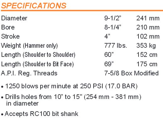 Valveless down hole hammer design. Ability to drill efficiently against high heads of water. Designed to operate at pressures up to 250 PSI (17.0 BAR). Reversible non-ported piston case for extended life. Superior directional stability in horizontal applications. Ejecting cuttings through the collection tube eliminates traditional hole cleaning problems. Environmentally sensitive- no foam required for hole cleaning and lubricants are not free to contaminate the formation. Typical vertical and horizontal applications include: caissons, piles/rock sockets, tunneling underloads, foundation drilling and other jobs where large volume rock excavation is required.