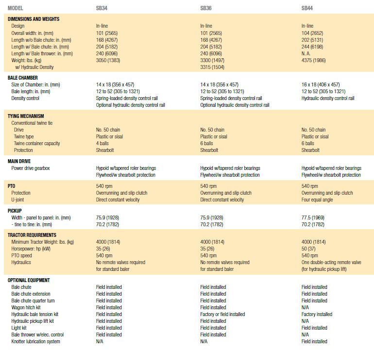 - Hydraulic bale thrower (Available on SB34 and SB36)Hydraulic bale density control (Standard on SB44; optional on SB34 and SB36)