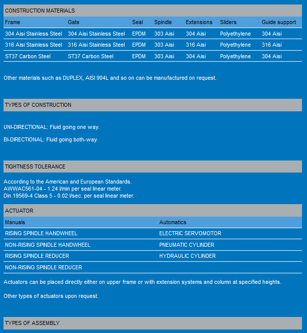 Sealed on 3 sides for installation on open channels and regulation of the flow. Fabricated square or rectangular port sliding channel gate for installation embedded in concrete and seals on 3 sides. Modulate design so that the frame be closed. Different construction materials, tightness by elastomer seal and guiding system with sliders to reduce coefficient of friction . Standard manufacturing dimensions 200 x 200 through 2000 x 2000 mm. Other dimensions upon request.