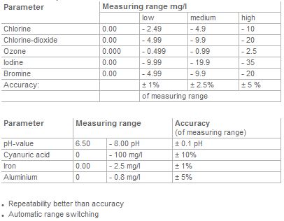 - Determination of free and bound chlorine, chlorine dioxide, ozone, iodine, bromine, cyanuric acid, dissolved iron, dissolved aluminium, pH-value and ORP/redoxpotential.