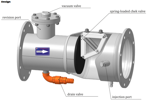 Chemical check valves are used to prevent the backflow of chemically treated water from irrigation systems to the source of water. It is installed to inject a chemical with the help of the injection pump that pumps it into the irrigation system. Silent, spring-loaded check valve is extremely efficient. There is also a built-in vacuum valve to arrange air outflow and vacuum discharge when the flow stops, and also low pressure drainage to arrange water discharge at the inlet side of the check valve. Maximum pressure: 10 bar (1.0 MPa).