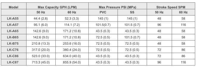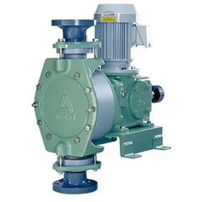 The Iwaki LK Seriesmetering pumps are motor-driven, mechanically-actuated diaphragm metering pumps. This larger Series can achieve outputs up to 856 GPH (3240 l/h) and maximum pressures of 220 PSI (1.5 MPa). The LK Series is ideal for large chemical feed applications in a wide range of fields, including water treatment, chemical process, agriculture, mining and paper.