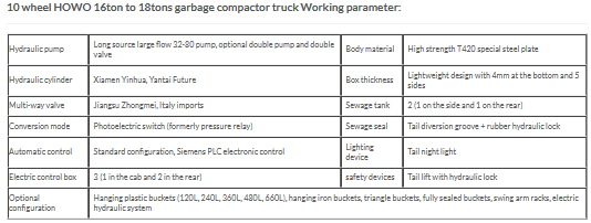 10 wheel HOWO 16ton to 18tons garbage compactor truck Bodywork configuration: Compressed volume 16-20m3, made of T420 special steel plate integrally bent, equipped with Xiamen Yinhua hydraulic cylinder oil leakage replacement, double pump confluence + double valve control, Zhongmei multi-way valve, Siemens PLC control, electro-optical switch, 2 sewage collection boxes, 3 operation control boxes, with night lighting, equipped with two-way compression function, the two-way hydraulic lock does not leak water.