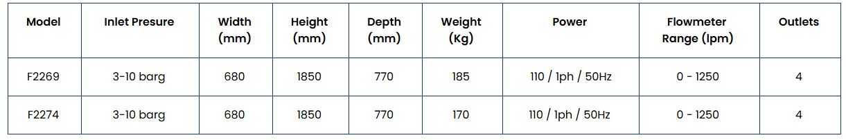 The F2269 and F2274 both incorporate 4 flow channels each with electronic mass flow meters. The input pressure can be adjusted by a pressure regulator. The flow from each channel is then easily adjusted with a ‘fine tune’ control valve and the sophisticated alarm system allows each flow channel to be pre-set with its own airflow parameters. In the event of the alarm being activated, an audible warning will sound and a red beacon will flash on top of the unit. The LED display will identify the reason why the alarm has been activated.