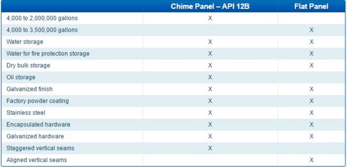 Superior Tank offers both chimed and flat panel bolted steel tanks to meet the various needs of our customers. Our chimed steel tanks are designed to the American Petroleum Institute (API) 12B standard and range in size from 4,000 to 2,000,000 gallons. In addition to petrochemical and oil storage, our chimed bolted steel tanks are well suited for storage of potable water, wastewater, water for fire protection and dry bulk materials. When additional capacity is needed, one of our flat panel bolted steel tanks can offer up to 3,500,000 gallons capacity without compromising strength or durability. Unlike other flat panel designs on the market, our steel does not thin at the edges, therefore maintaining maximum strength throughout the panel.