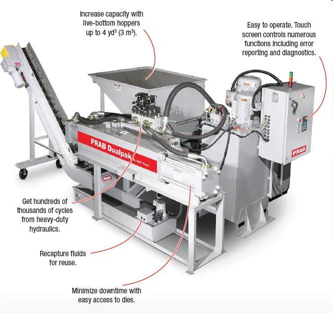 PRAB`s Dualpak briquetter by Neff Press increases the value of your metal chips, turnings and swarf by compressing it into solid briquettes. Augers feed chips into a compression chamber. Then two opposing hydraulic cylinders press the metal, squeezing out the cutting fluid or coolant and creating a compact, up to 99 percent dry, briquette.